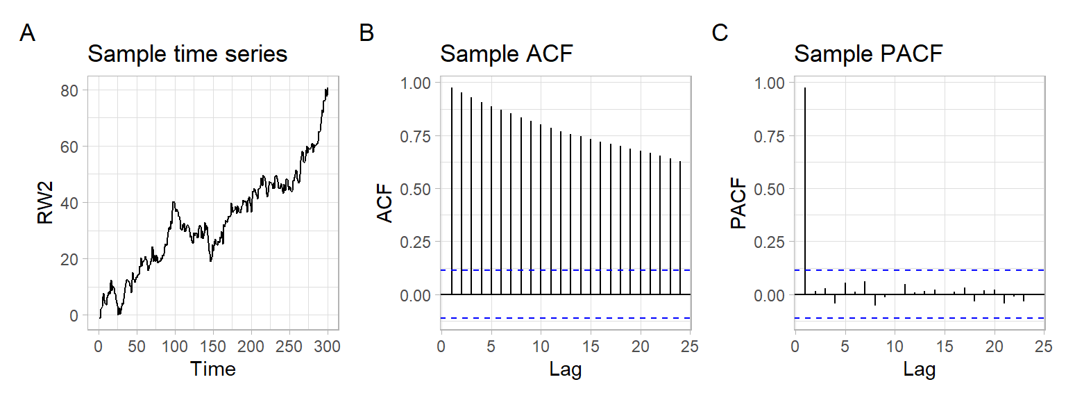 Random walk patterns are widely found in nature, for example, in the phenomenon of Brownian motion. Notice the slow linear decay in the ACF of nonstationary time series (Figure 4.2) \[ S_t = \sum_{i = 1}^t X_i, \tag{4.2}\] where \(X_t \sim \mathrm{i.i.d.}(0, \sigma^2)\) and \(\sigma = 2\).