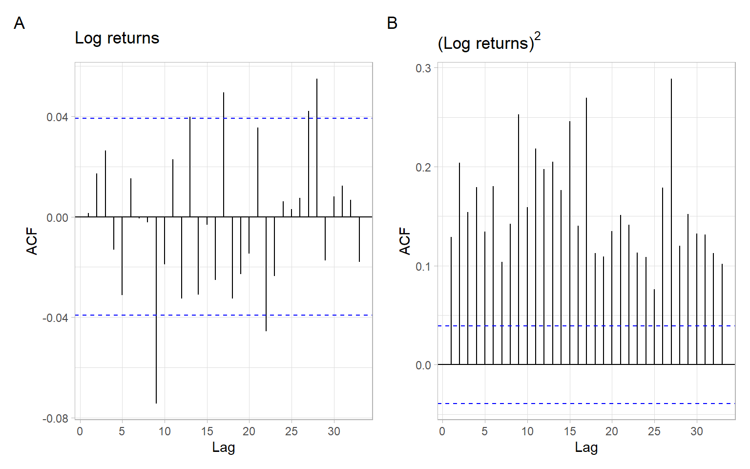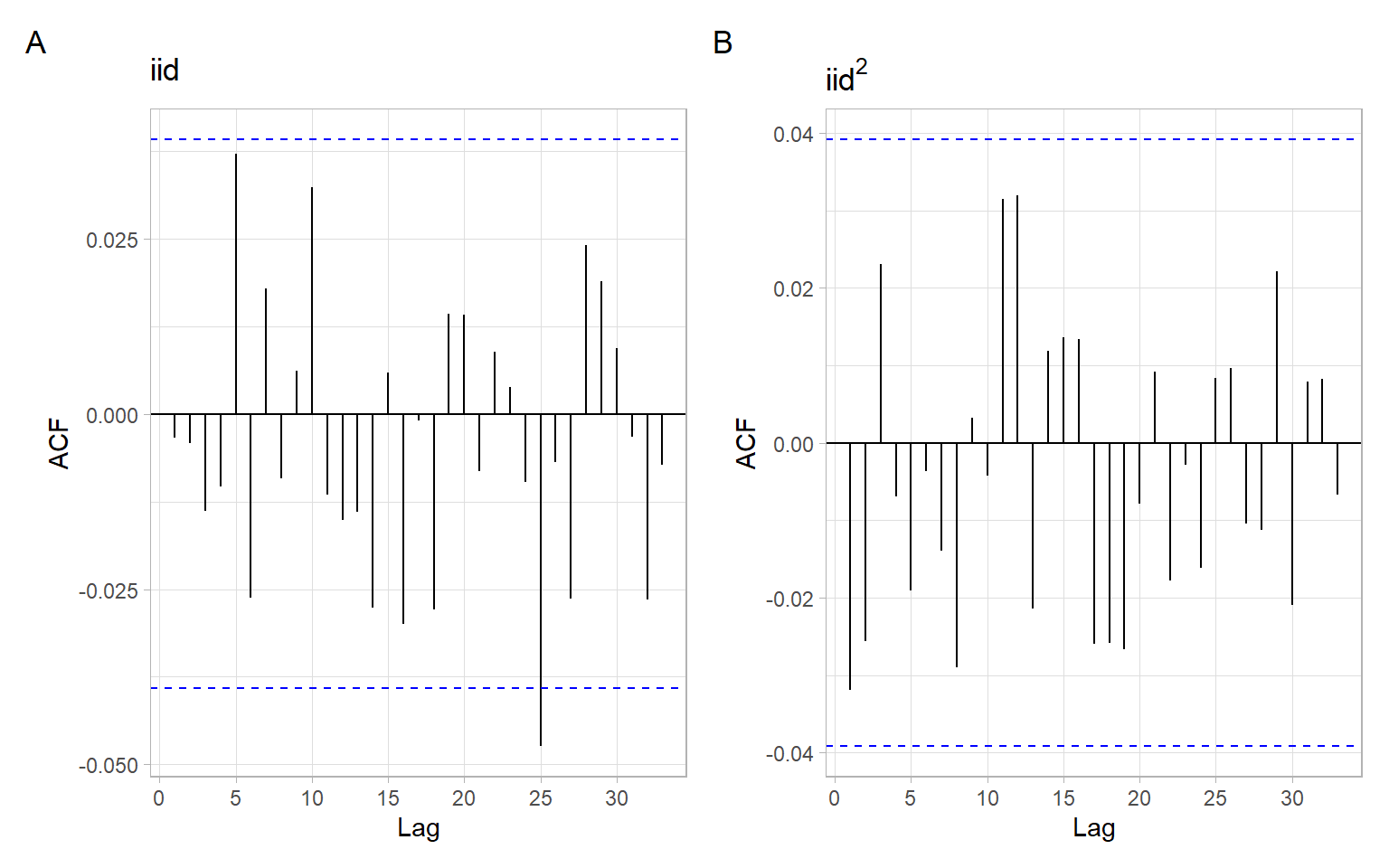 Figure 6.2 is the simplest check for the presence of ARCH effects: when the time series is not autocorrelated but is autocorrelated if squared.