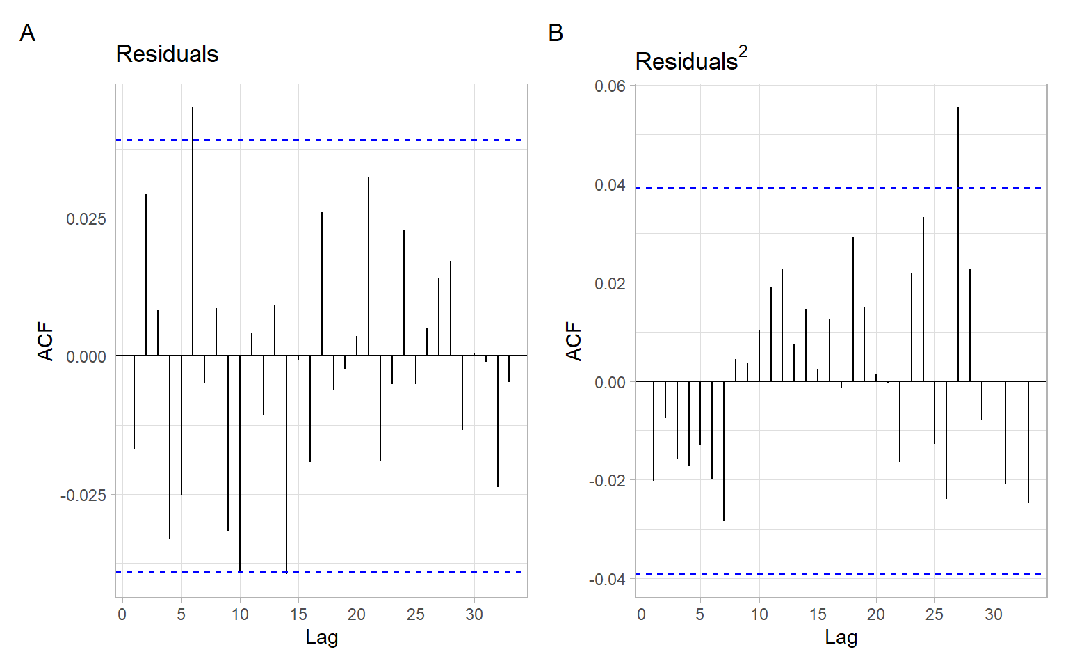 Next, we run diagnostics of the fitted model, i.e., whether the residuals \(\varepsilon_{t}\) are white noise and are normally distributed. The code plot(garch11) generates scatterplots, histograms, Q-Q plots, and ACF plots of the original data and the obtained residuals (Figure 6.4). Of course, the analysis can be performed also with separate commands. For example, see the ACFs of the residuals (Figure 6.5).