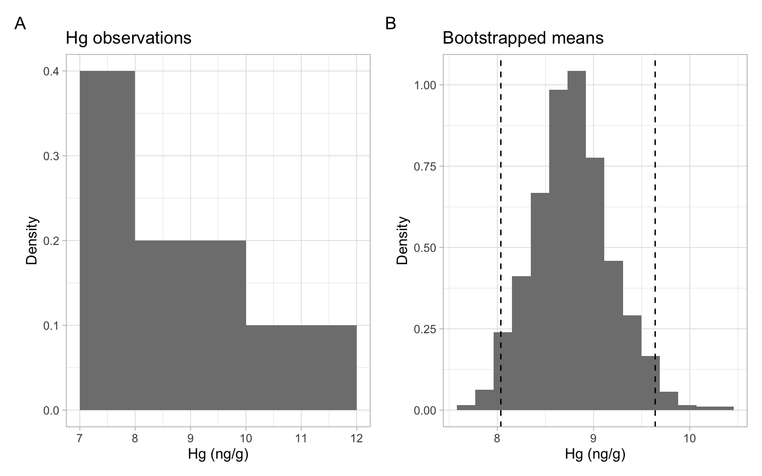 Consider a small sample of mercury (Hg) concentrations in fish tissue (Lyubchich et al. 2016). These observations do not constitute a time series; the data were collected in such a way that we can treat the samples as independent. Figure 7.2 A shows that the underlying population of Hg concentrations is likely not normally distributed, so we will use bootstrapping to calculate a confidence interval for the mean.
