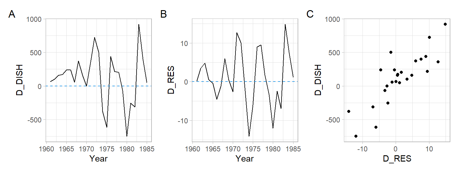 The series of first-order differences look stationary (Figure 8.4). Use these differenced series instead of the original time series in a regression model: \[ \Delta Y_t = \beta_0 + \beta_1 \Delta X_t + \epsilon_t. \]