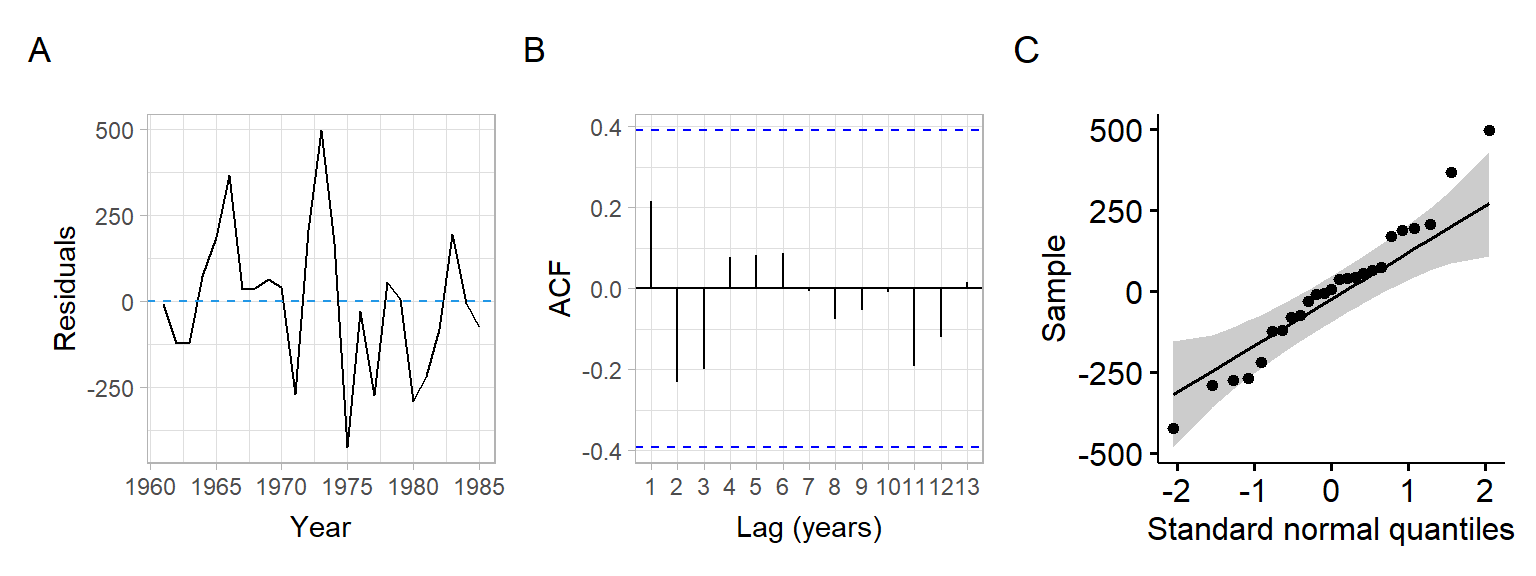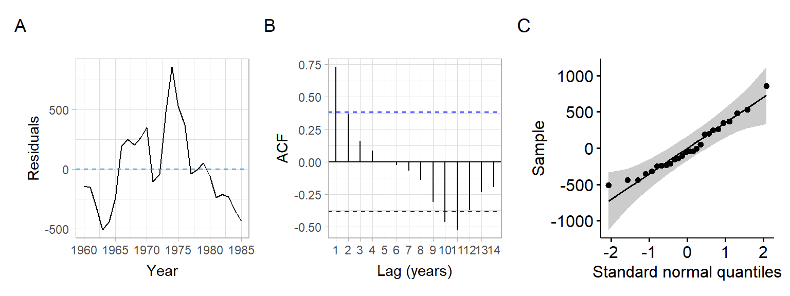 Based on the time series plots (Figure 8.2), a linear time trend would fit these data, since we see a linear increase of values with time (so we add a linear time effect \(t\) in our model). Alternatively, e.g., if we observed parabolic structure, we could include \(t+t^2\) or another form of trend.
