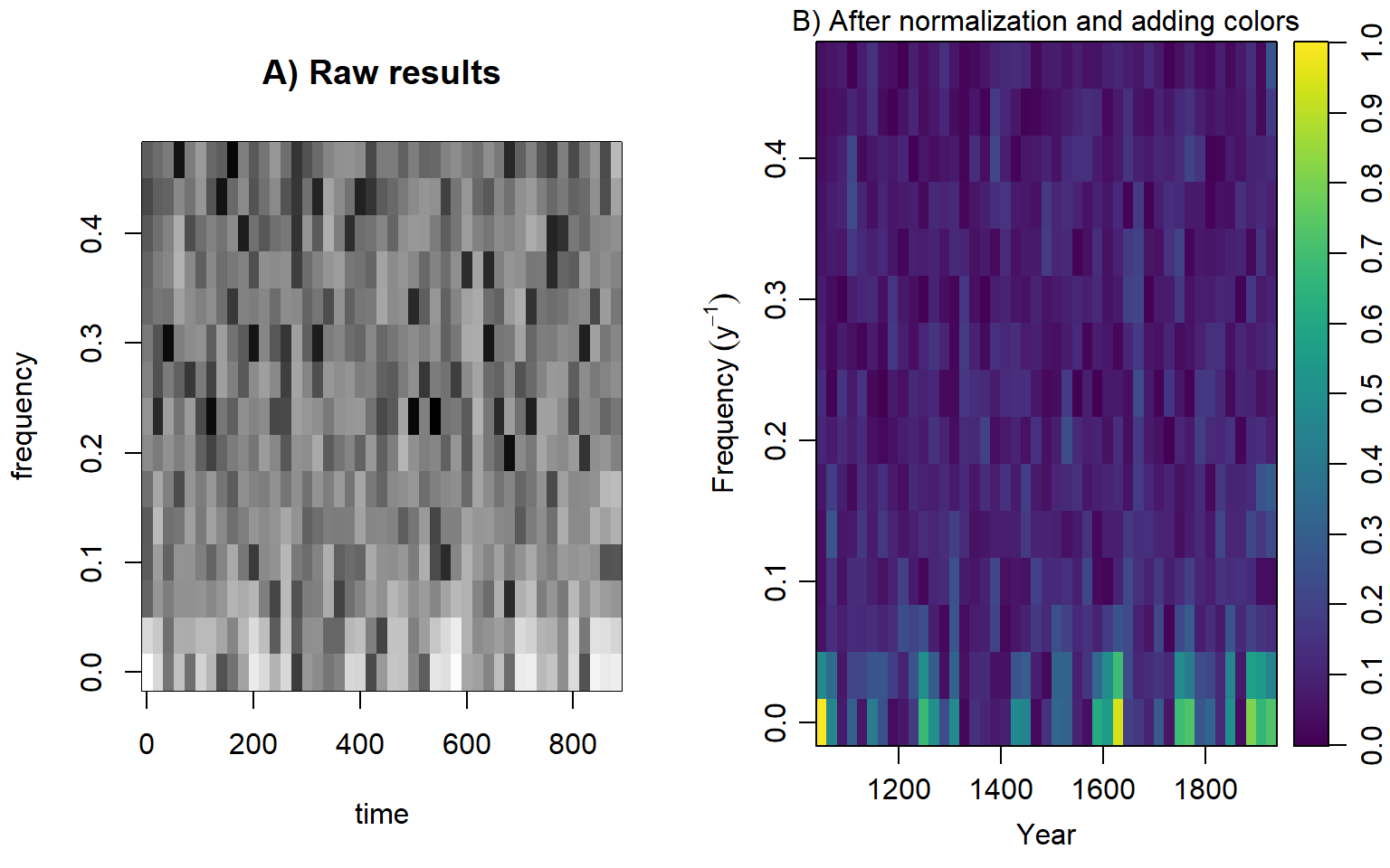 Figure 13.1 B shows that the spectrum of the raw data is dominated by low frequencies (trend). After detrending the data (Figure 13.1 C), the spectrum at frequency 1 (meaning one cycle per year) is the dominant one.