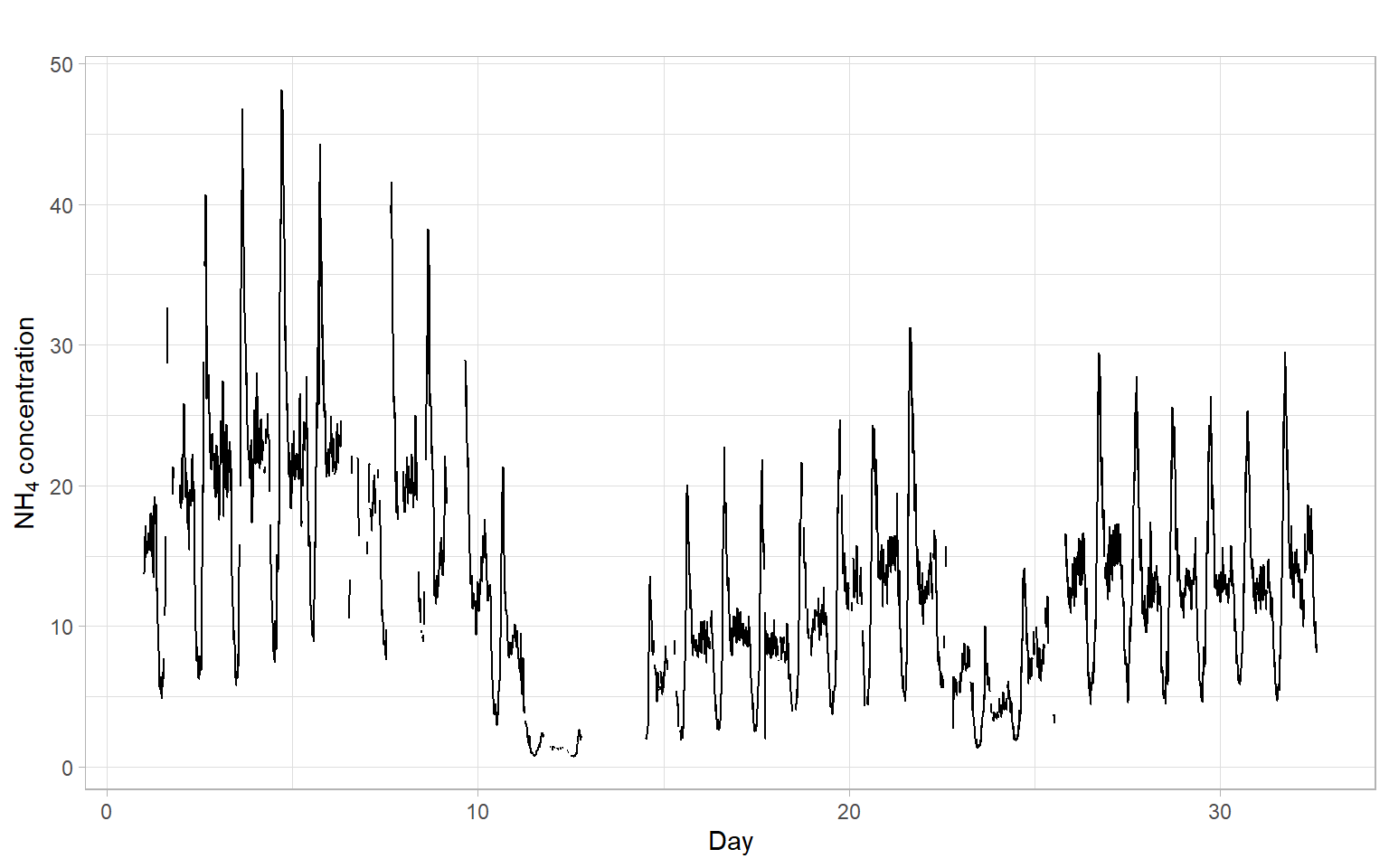 For example, consider a time series imputeTS::tsNH4 of ammonium (NH\(_4\)) concentration in a wastewater system (Figure 13.4). This time series contains observations from regular 10-minute intervals, but some of the observations are missing.