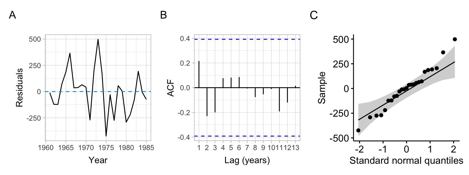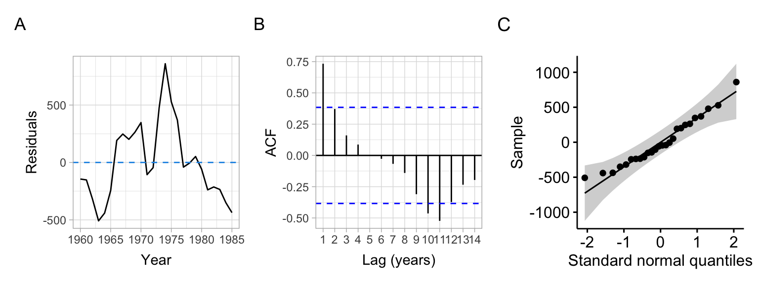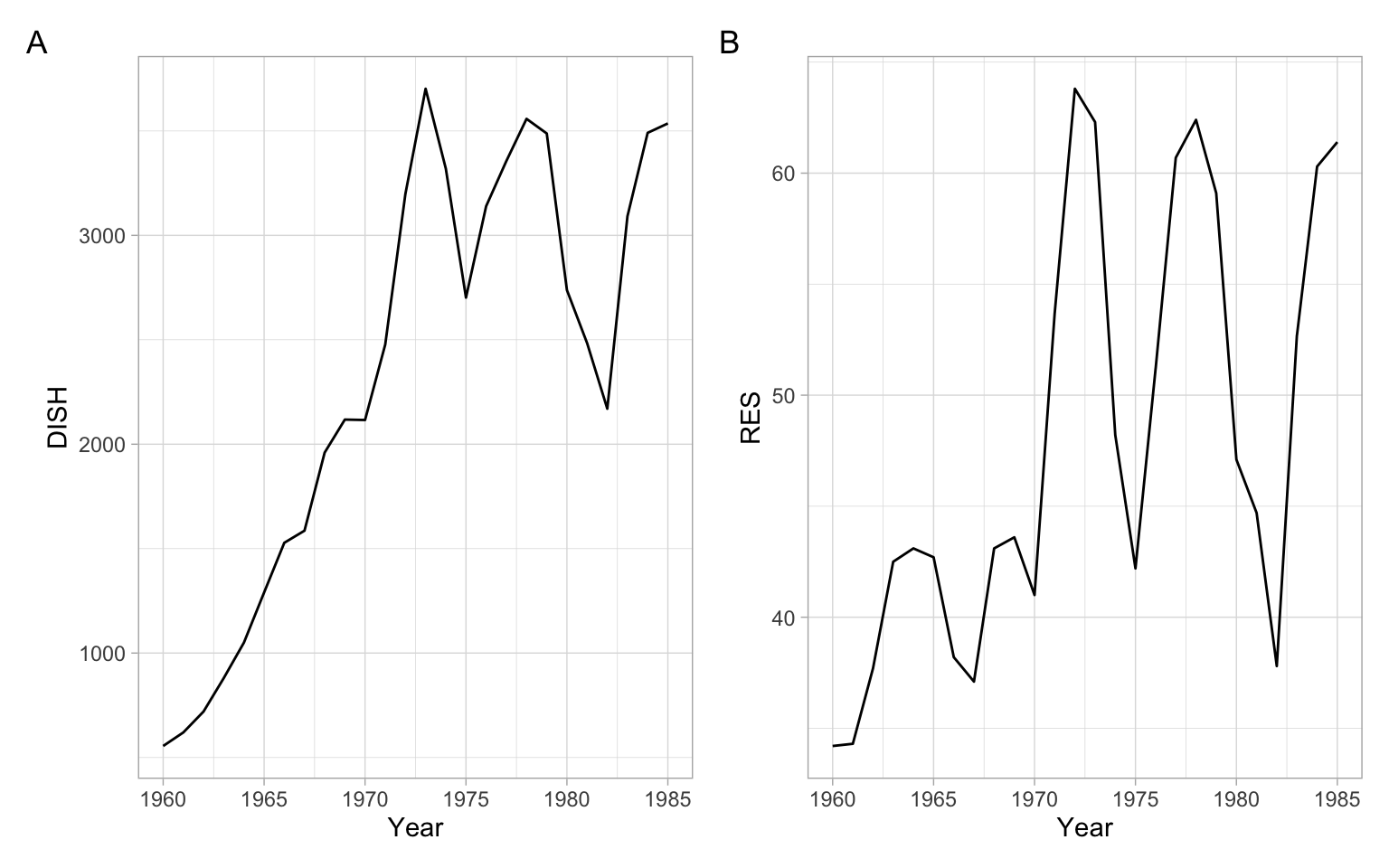 Based on the time series plots (Figure 8.2), a linear time trend would fit these data, since we see a linear increase of values with time (so we add a linear time effect \(t\) in our model). Alternatively, e.g., if we observed parabolic structure, we could include \(t+t^2\) or another form of trend.