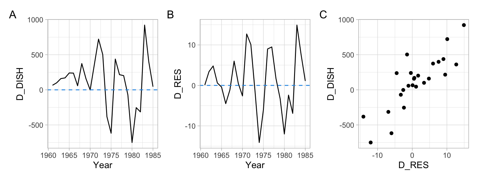 The series of first-order differences look stationary (Figure 8.4). Use these differenced series instead of the original time series in a regression model: \[ \Delta Y_t = \beta_0 + \beta_1 \Delta X_t + \epsilon_t. \]