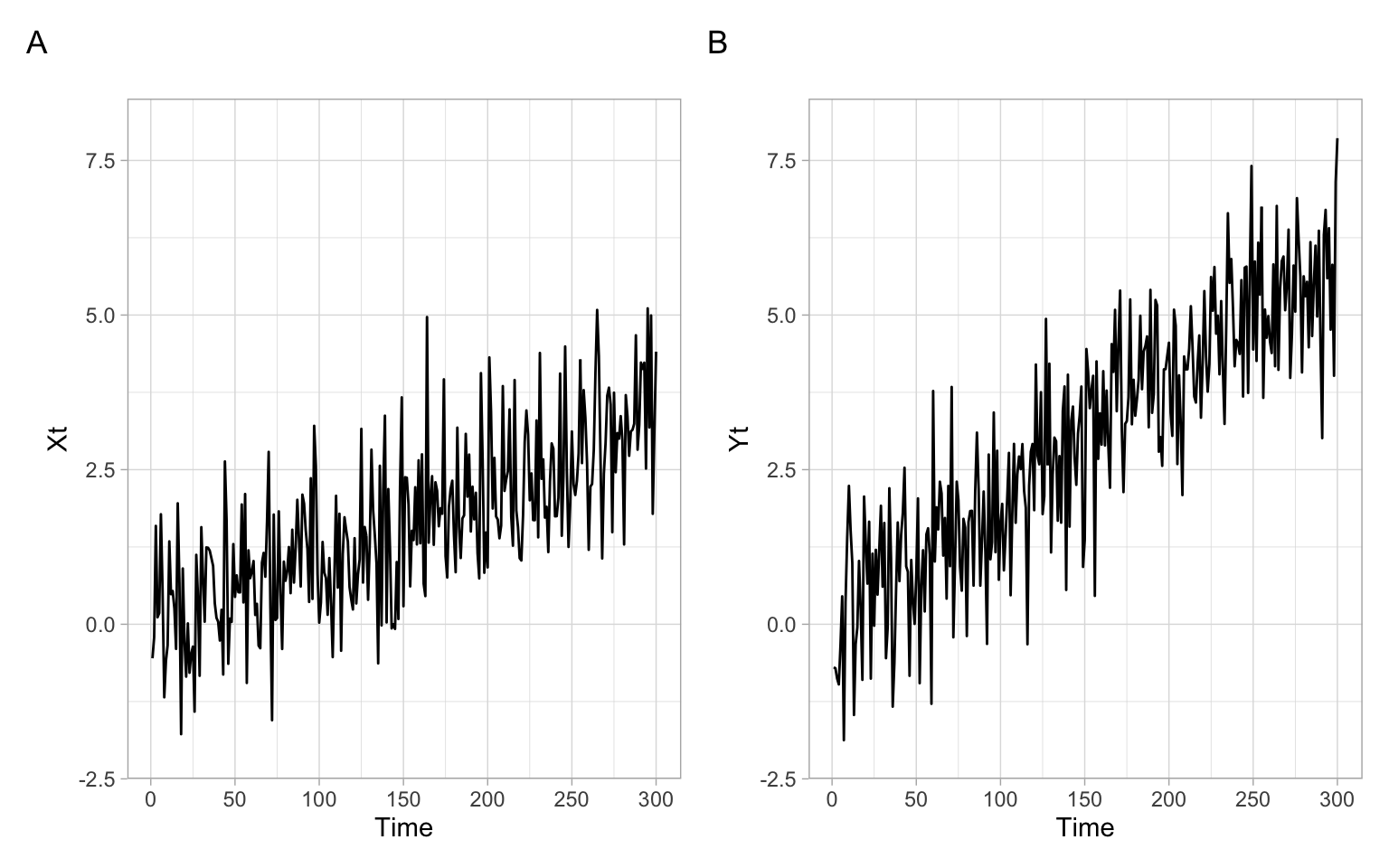 Consider a situation when we are given time series with trends (like in Figure 8.2), we do not know the data generating process (DGP; i.e., the true dependence structure), and we want to use these series in regression analysis.