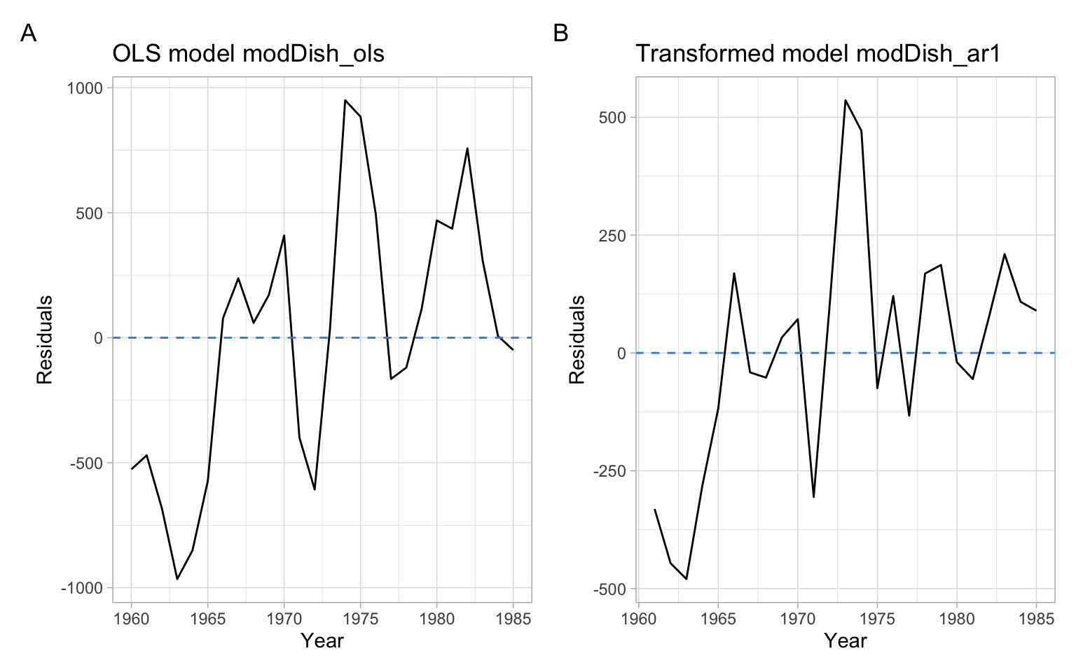 modDish_ols <- lm(DISH ~ RES, data = D)Here we use time series data (ordered by \(t\)), thus, Equation A.1 will be written with the time indices \(t\) as \[ y_t=\beta_0+\beta_1x_t+\varepsilon_t, \tag{B.1}\] where the regression errors at times \(t\) and \(t-1\) are \[ \begin{split} \varepsilon_t&=y_t-\beta_0-\beta_1x_t,\\ \varepsilon_{t-1}&=y_{t-1}-\beta_0-\beta_1x_{t-1}. \end{split} \tag{B.2}\]