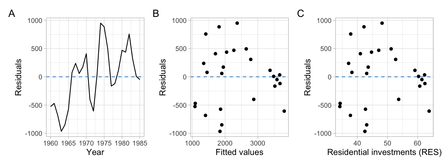 Sometimes it is possible to transform the dependent or independent variables to remedy these problems, i.e., to get rid of the correlated residuals or to stabilize the variance (see ?sec-wls and Appendix B). Otherwise, we need to change (re-specify) the model.