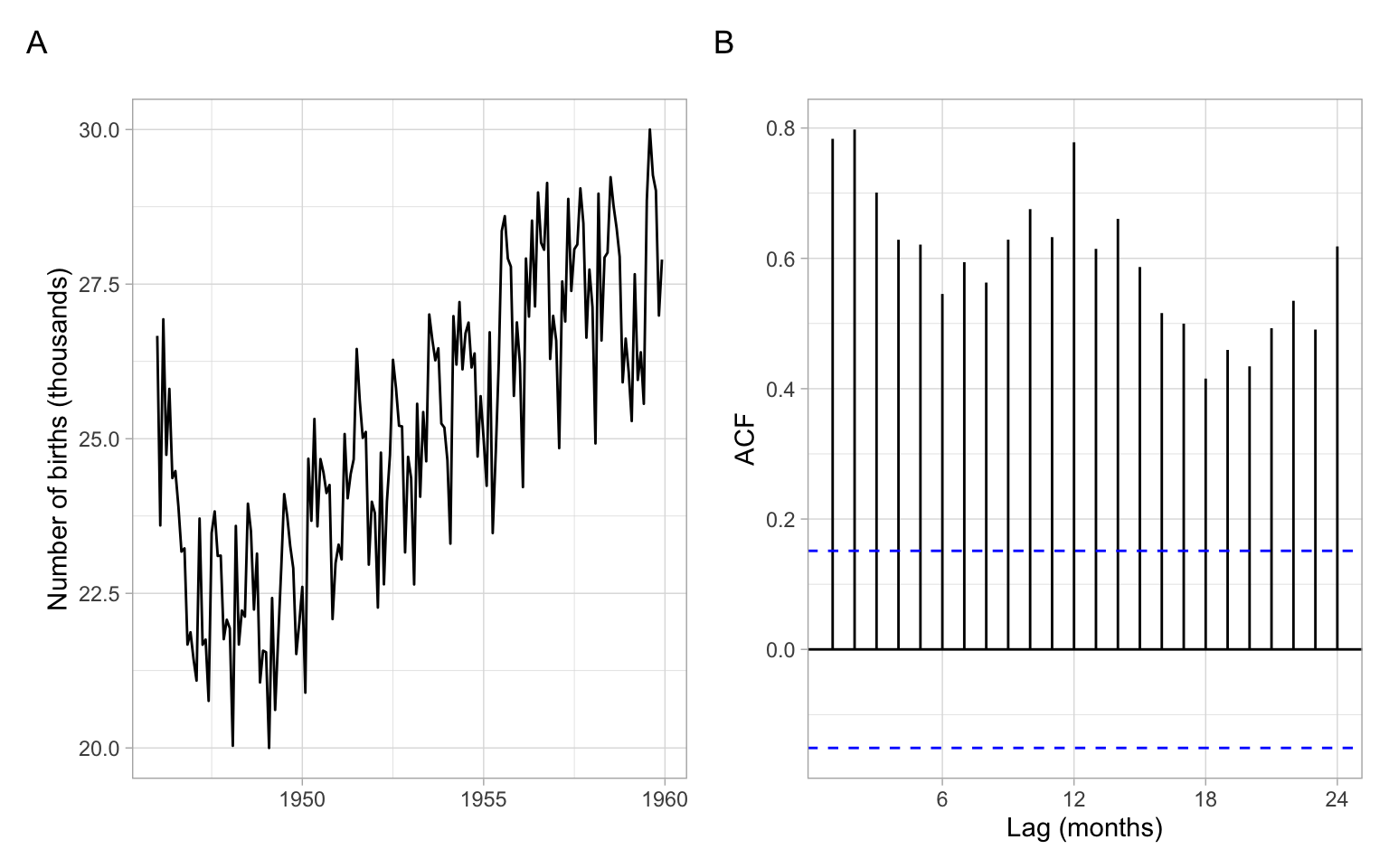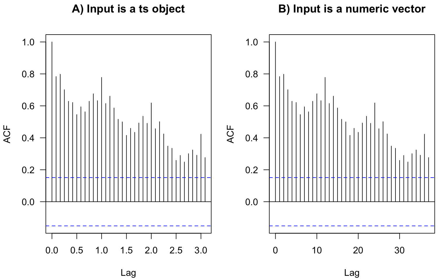 We don’t have to convert data to this format. If we plot the ACF of just a vector without these attributes, the values are the same, just the labels on the horizontal axis are different (Figure 2.13). For monthly data, as in the example here, the frequency is 12. Hence, here the ACF at lag 0.5 (Figure 2.13 A) means autocorrelation with the lag \(h=6\) months (Figure 2.13 B); lag 1 (Figure 2.13 A) corresponds to one whole period of \(h=12\) months (Figure 2.13 B), and so on.