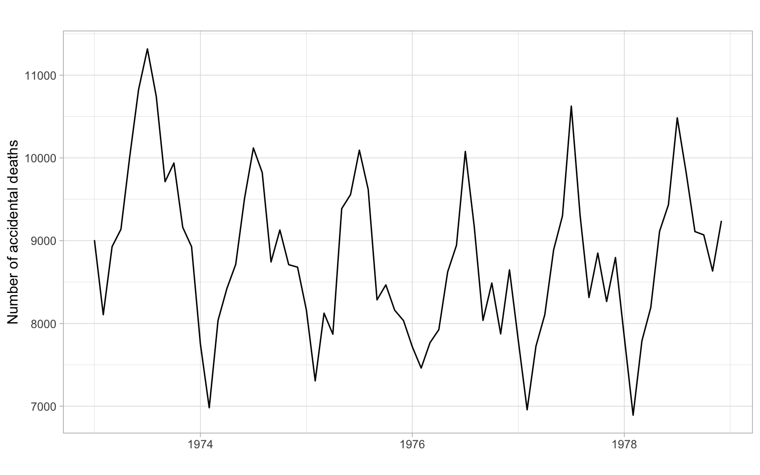 plotly::ggplotly(p)The goal of this lecture is to introduce time series and their common components. You should become confident in identifying and characterizing trends, seasonal and other variability based on visual analysis of time series plots and plots of autocorrelation functions.