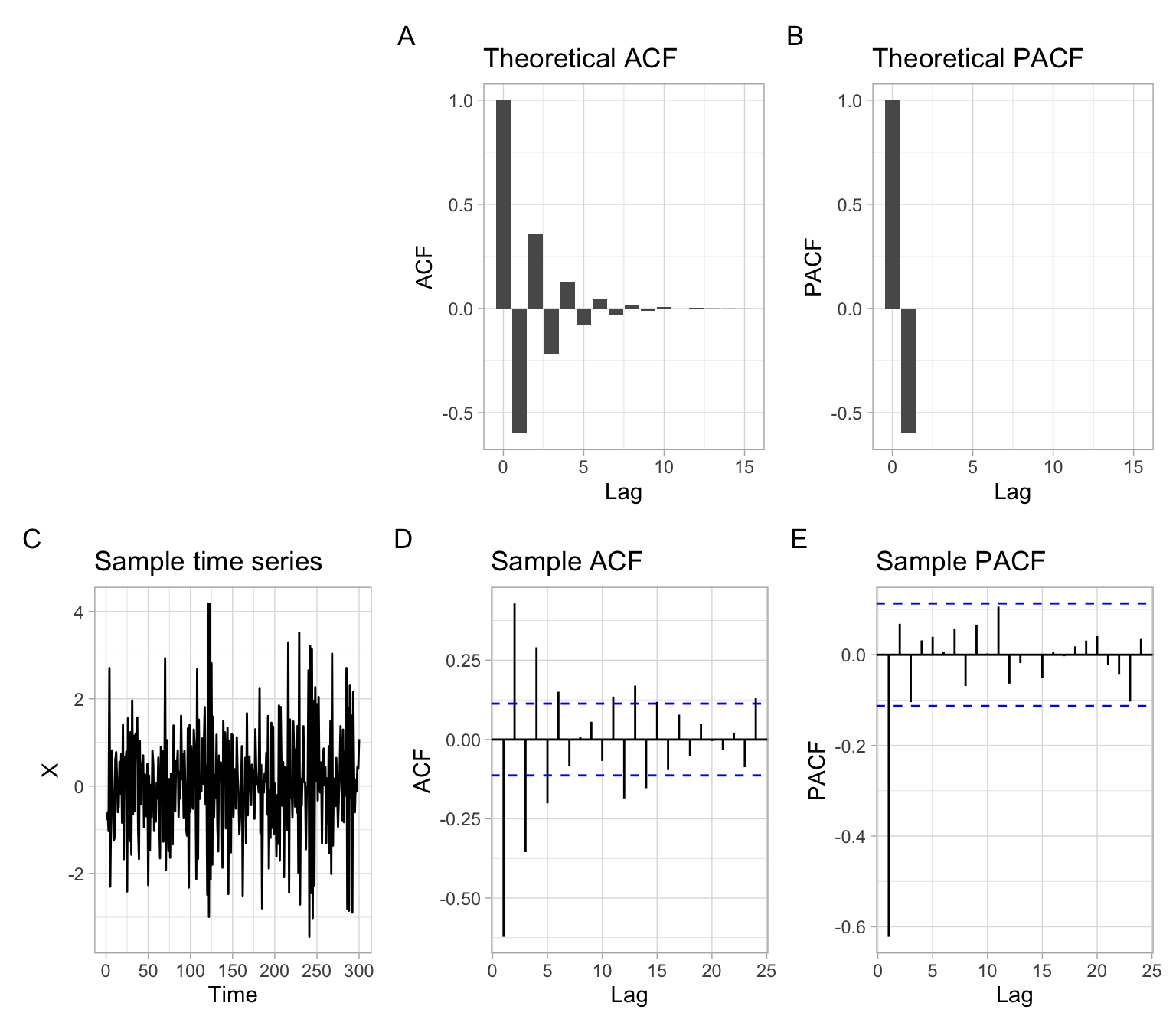 See the plots for the following AR(1) process in Figure 4.5 (only the coefficient \(\phi_1\) changed from the previous specification): \[ X_t = \phi_1 X_{t-1} + \epsilon_t;\; \epsilon_t \sim N(0,\sigma^2);\; \phi_1=-0.6,\; \sigma = 1. \tag{4.8}\]
