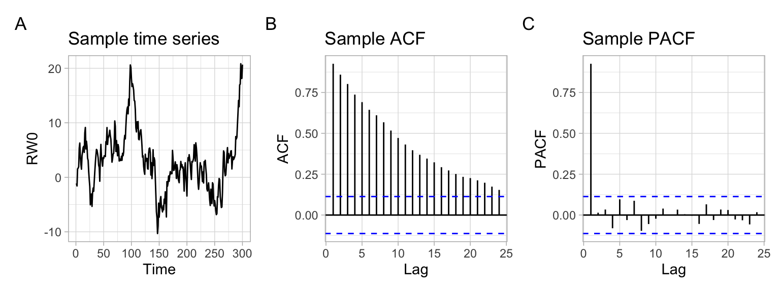 See the plots for the following AR(1) process in Figure 4.4: \[ X_t = \phi_1 X_{t-1} + \epsilon_t, \tag{4.7}\] where \(\epsilon_t \sim N(0,\sigma^2)\), \(\phi_1=0.6\), and \(\sigma = 1\).
