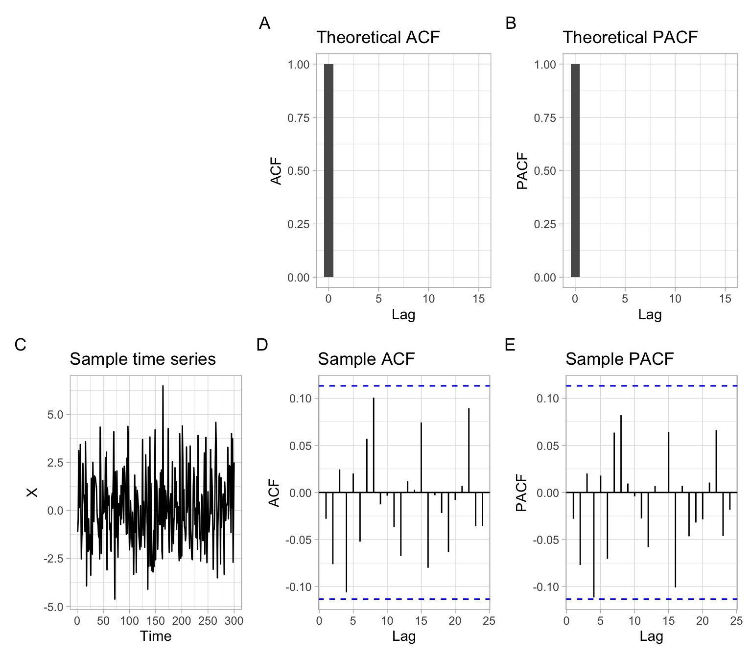 See Figure 4.1 with plots for \(X_t \sim \mathrm{WN}(0, \sigma^2)\), where \(\sigma = 2\). More specifically, \[ X_t \sim \text{i.i.d.}\; N(0, \sigma^2);\; \sigma = 2. \tag{4.1}\]