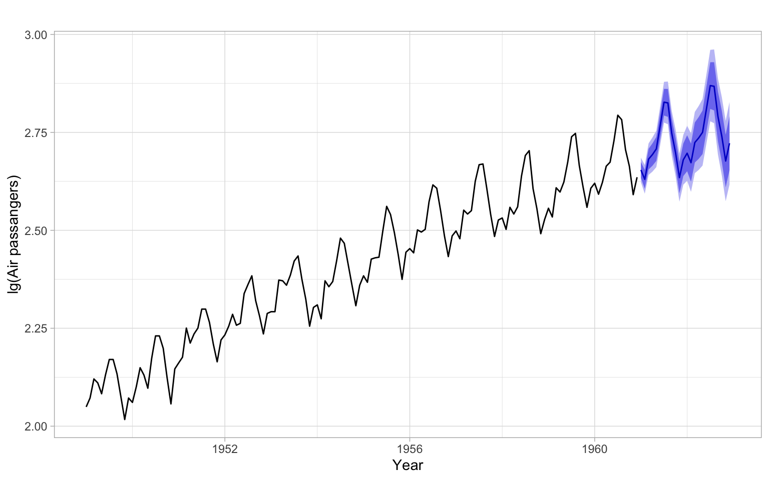 ggplot2::autoplot(forecast::forecast(mod_air, h =24))+xlab("Year")+ylab("lg(Air passangers)")+ggtitle("")