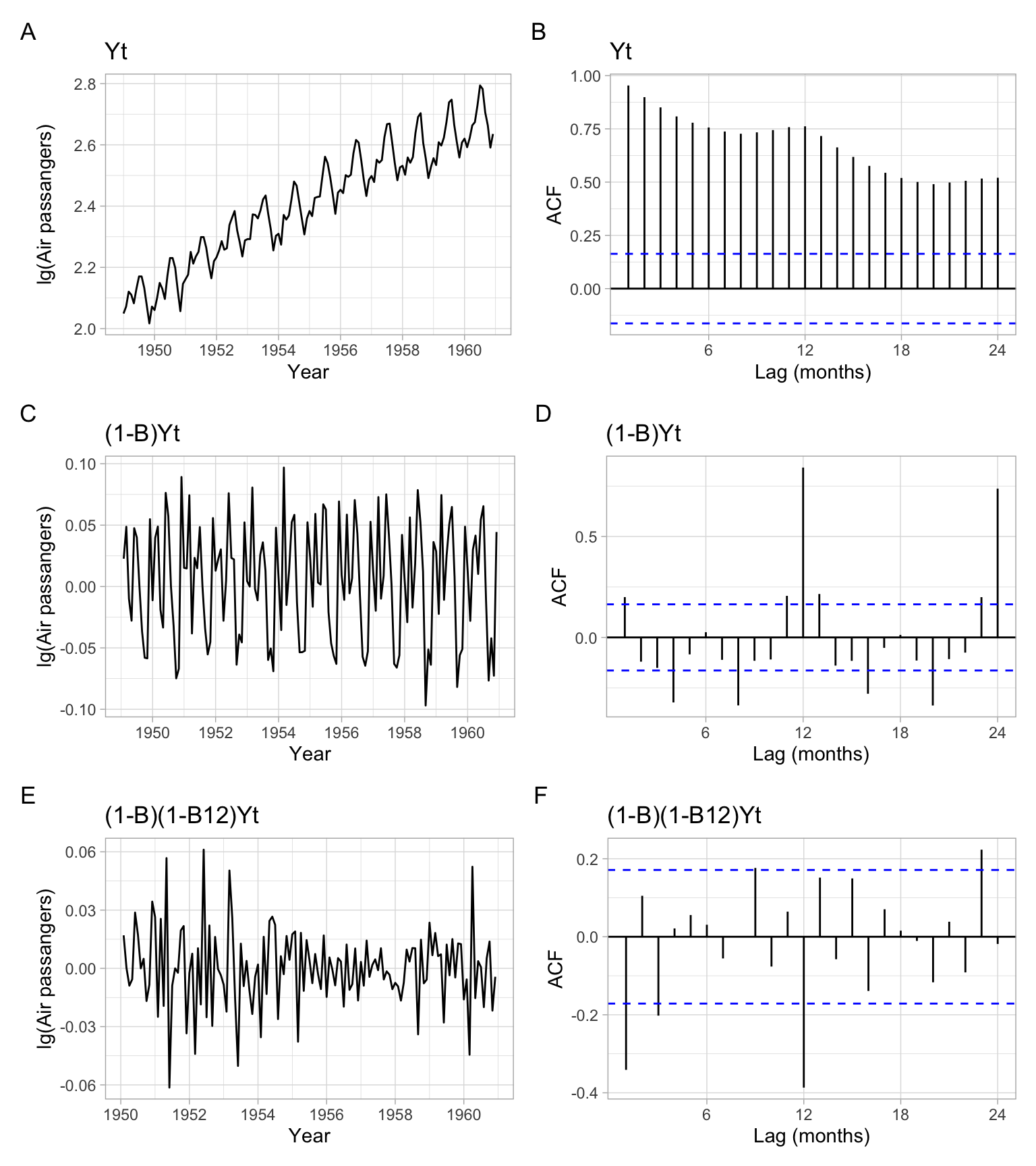Here we revisit the time series on airline passengers from which we have removed the trend by taking regular non-seasonal differences once (\(d = 1\)). Notice from Figure 5.5 C and D how after taking the usual differences the upward trend disappeared, and ACF started to decay much faster. At the seasonal lags, however, the ACF decays still linearly (Figure 5.5 D), which suggested differencing at the seasonal lag to remove strong periodicity. After taking seasonal differences once (\(D = 1\)), the time series looks stationary (Figure 5.5 E), and the ACF decays fast at both seasonal and non-seasonal lags. This is enough differencing.