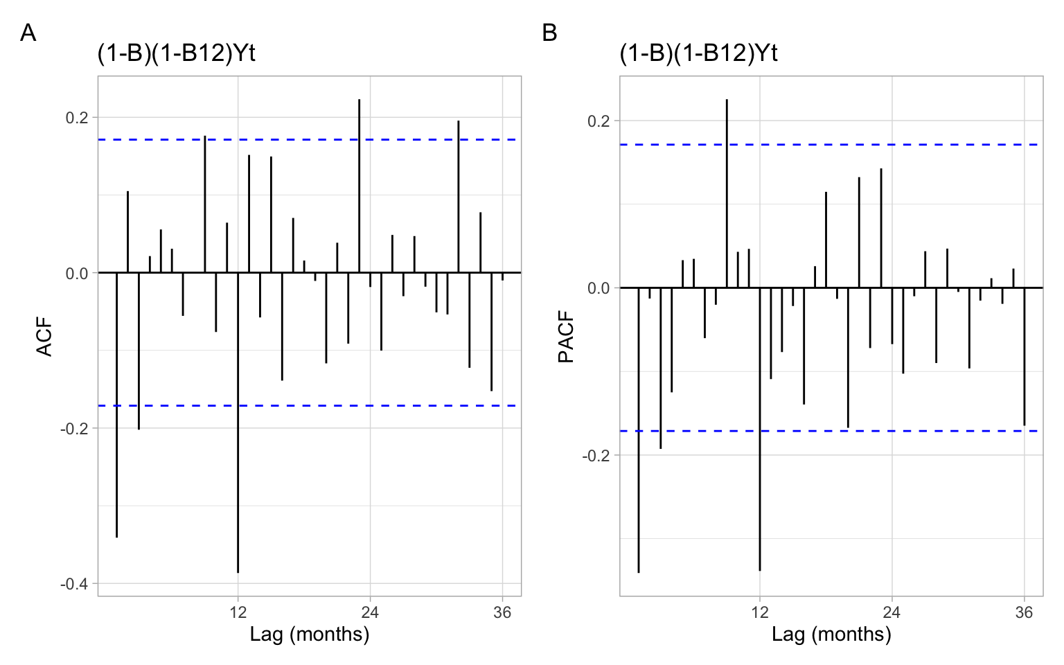 p6<-forecast::ggAcf(D1D12, lag.max =36)+ggtitle("(1-B)(1-B12)Yt")+xlab("Lag (months)")p7<-forecast::ggAcf(D1D12, lag.max =36, type ="partial")+ggtitle("(1-B)(1-B12)Yt")+xlab("Lag (months)")p6+p7+plot_annotation(tag_levels ='A')