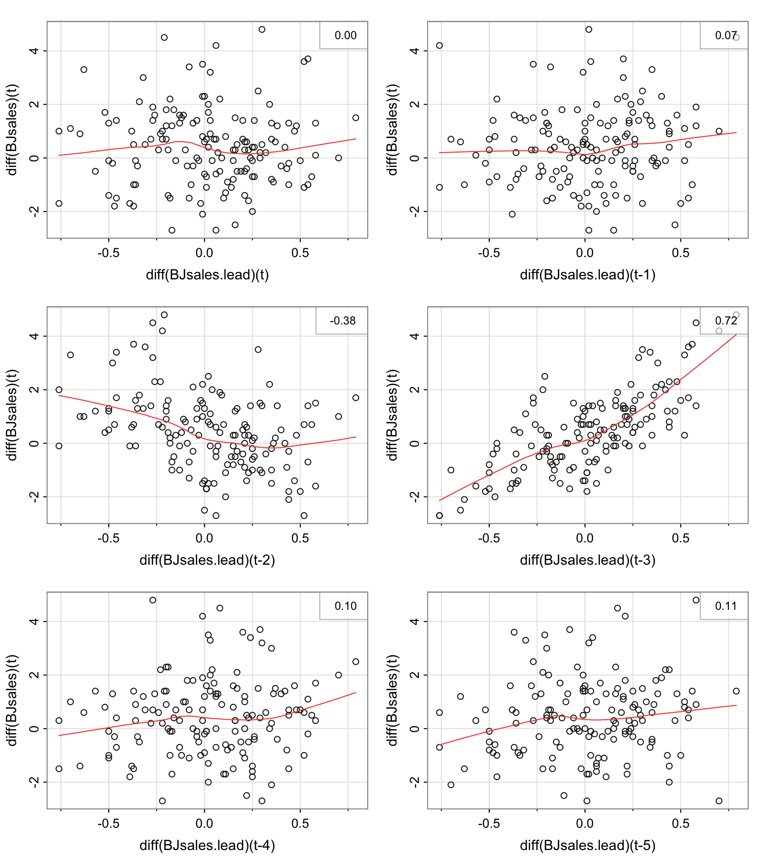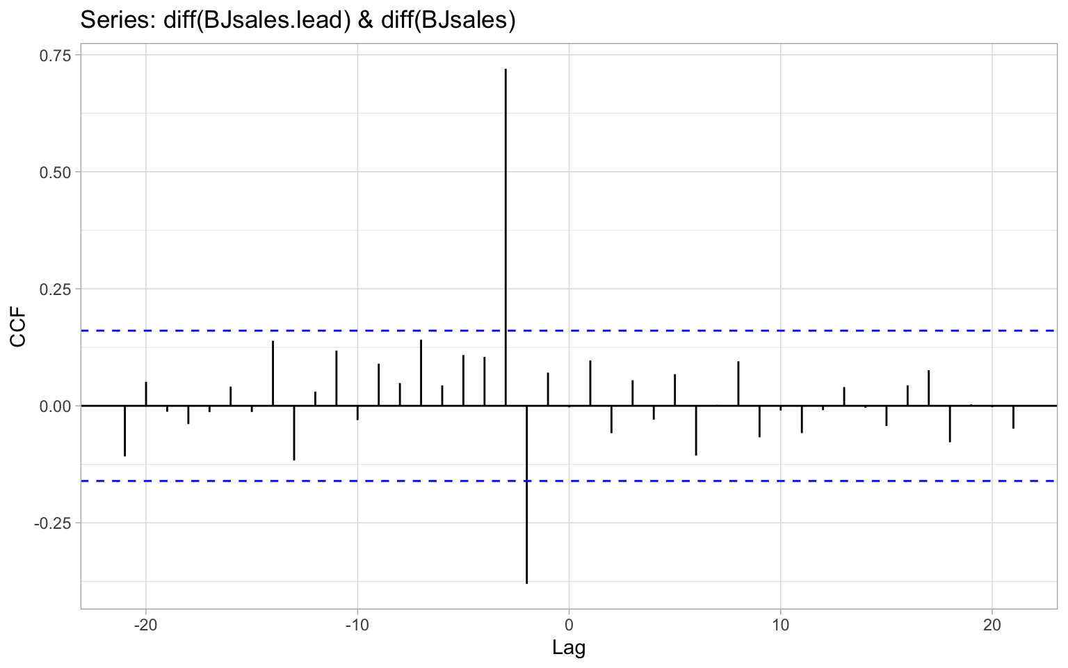 For example, Figure 9.1 shows the CCF for two time series of sales that have been detrended by taking differences. From this plot, lagged values of the first series, \(\Delta \mathrm{BJsales{.}lead}_{t - 2}\) and \(\Delta \mathrm{BJsales{.}lead}_{t - 3}\) are significantly correlated with current values of the second series, \(\Delta \mathrm{BJsales}_{t}\). Hence, we can call BJsales{.}lead a leading indicator for BJsales.