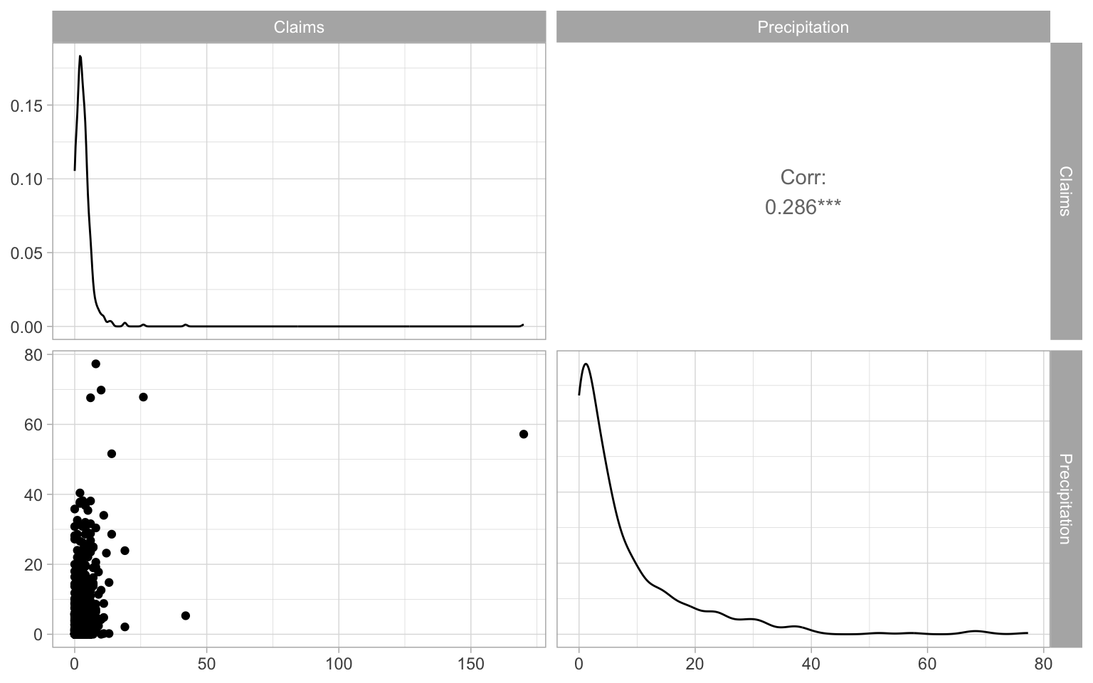 Reverse testing does not confirm a statistically significant Granger causality. Hence, we do not have enough evidence to claim that insurance claims are a Granger cause of precipitation (we could expect to come to this conclusion based on our knowledge of how things work), and hence there is no evidence of feedback between losses and precipitation.