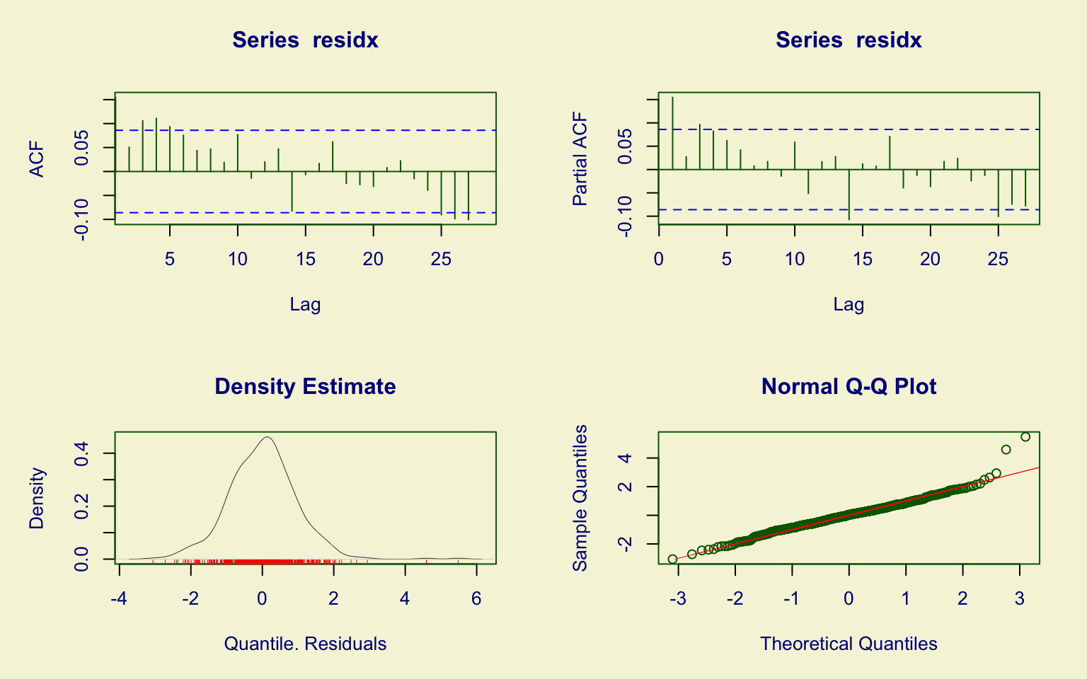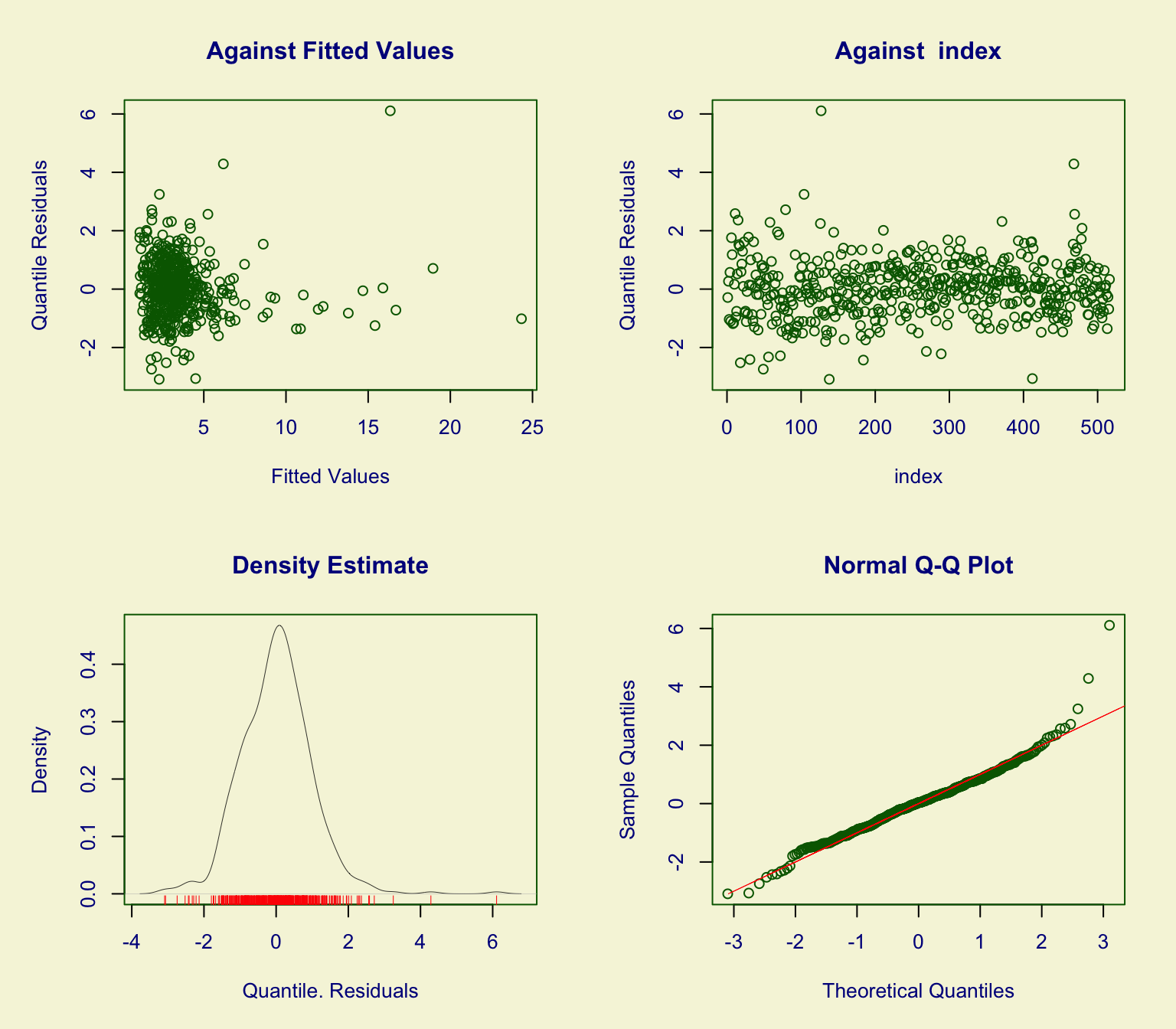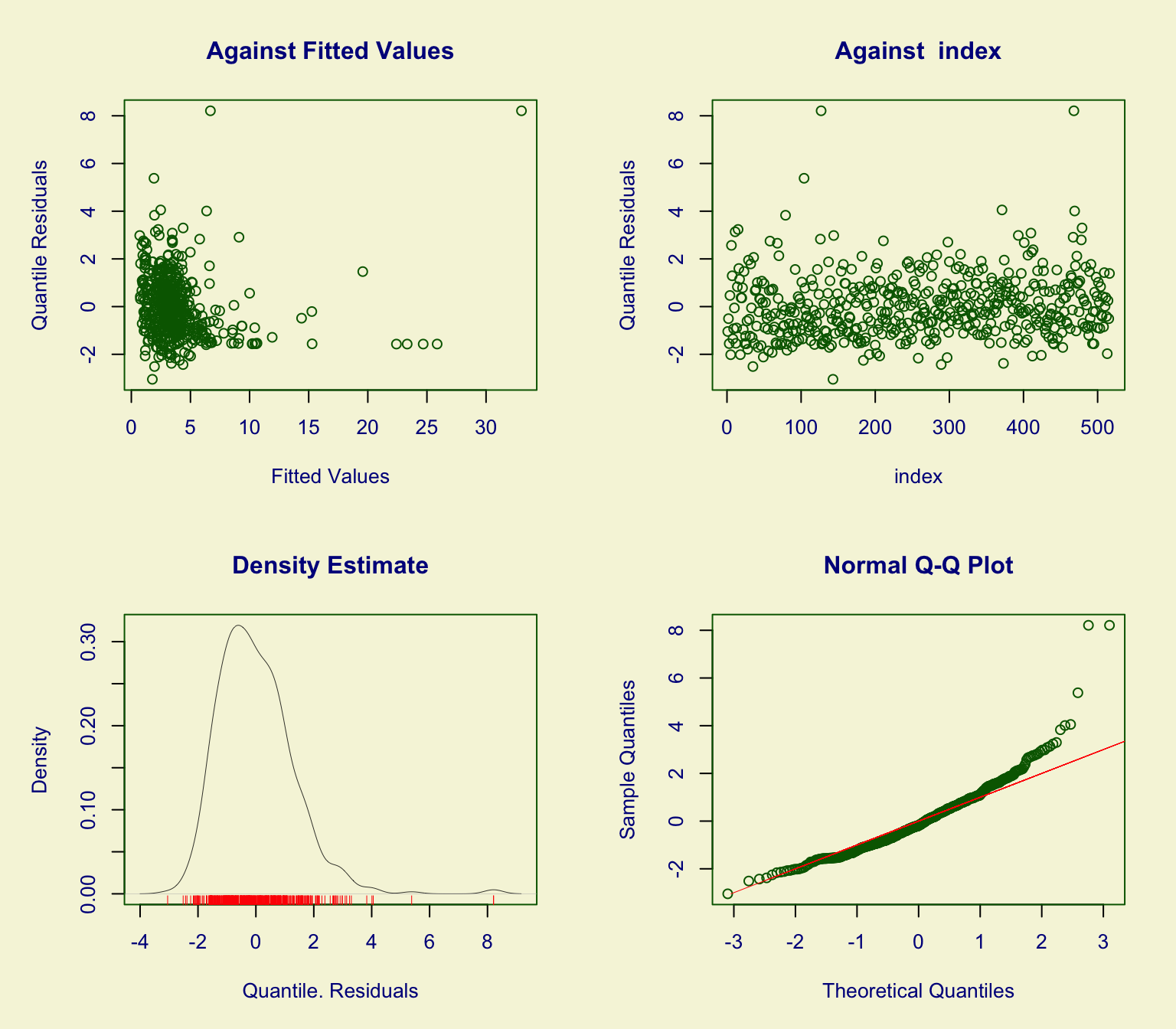 Figure 9.18: Residual diagnostics of the GAMLSS for the number of home insurance claims.