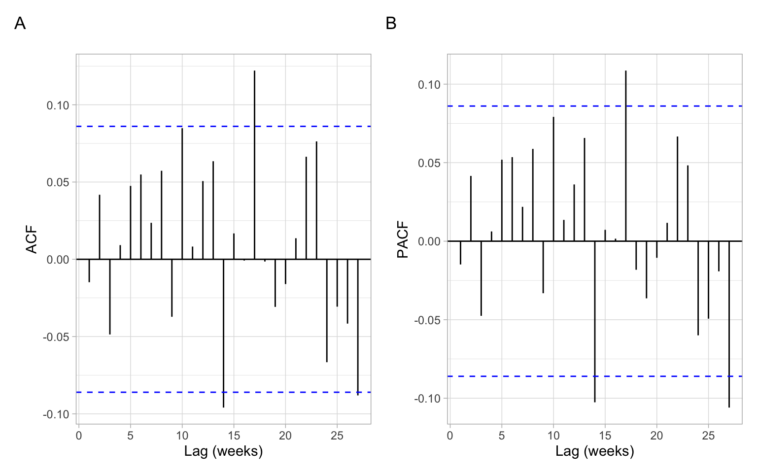 For the correlation estimates to work, we need to specify a grouping factor for the random effects. To create a grouping factor, we added a variable with the city ID; here it has only one level "City A" and hence does not affect the estimates substantially. If we had information from multiple cities, the specified form of autoregressive structure form = ~Week|City could readily accommodate it.