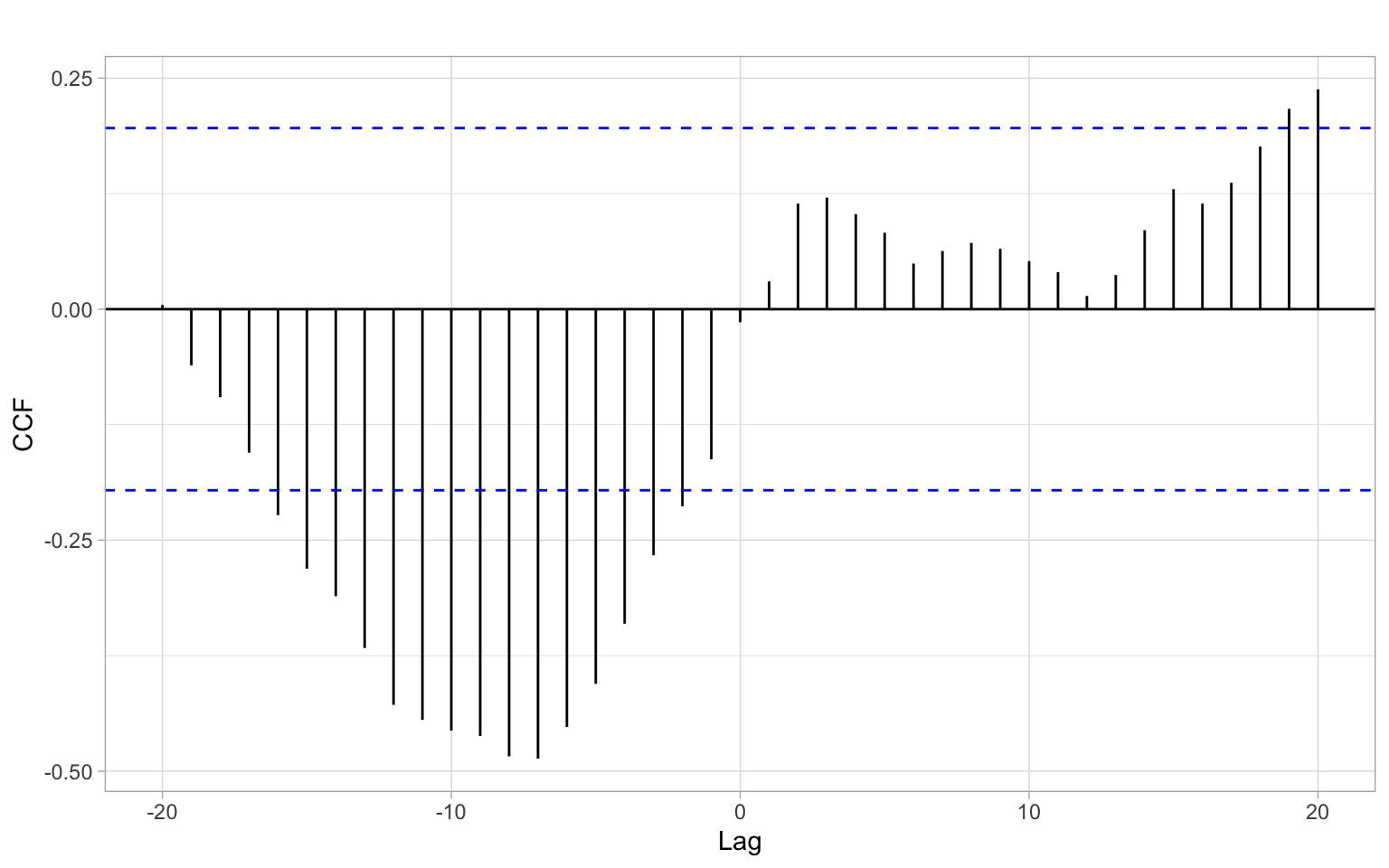 The functions ccf() and forecast::ggCcf() estimate the cross-correlation function and plot it as a base-R or a ggplot2 graph, respectively. The functions use the notations like in Equation 9.1, hence when using ccf(x, y) we are typically interested in identifying negative\(k\)s that correspond to correlation between past values of the predictor \(X_t\) and current values of the response \(Y_t\).