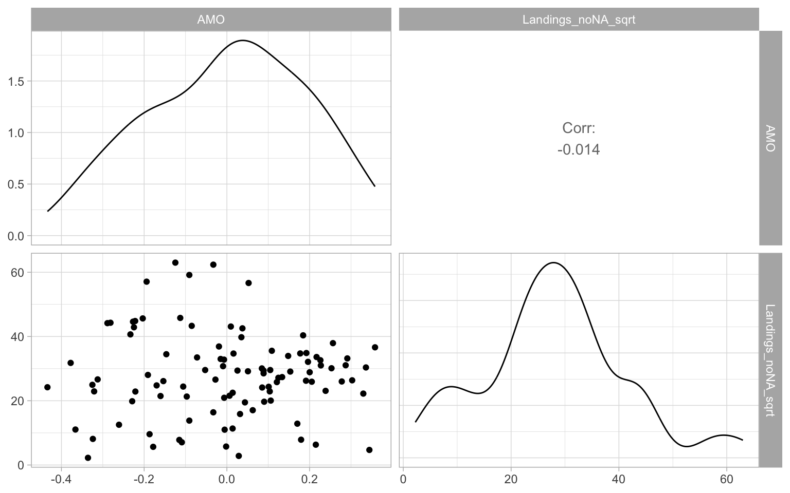 Here we have time series of 1918–2017 annual landings of golden tilefish (tonne) in the U.S. North Atlantic region and the Atlantic Multi-decadal Oscillation (AMO) index characterizing climatic conditions (Figure 9.4). These time series were described in Nesslage et al. (2021) with R code by Lyubchich and Nesslage (2020). The goal is to develop a regression model to explore the relationship between the landings and AMO.