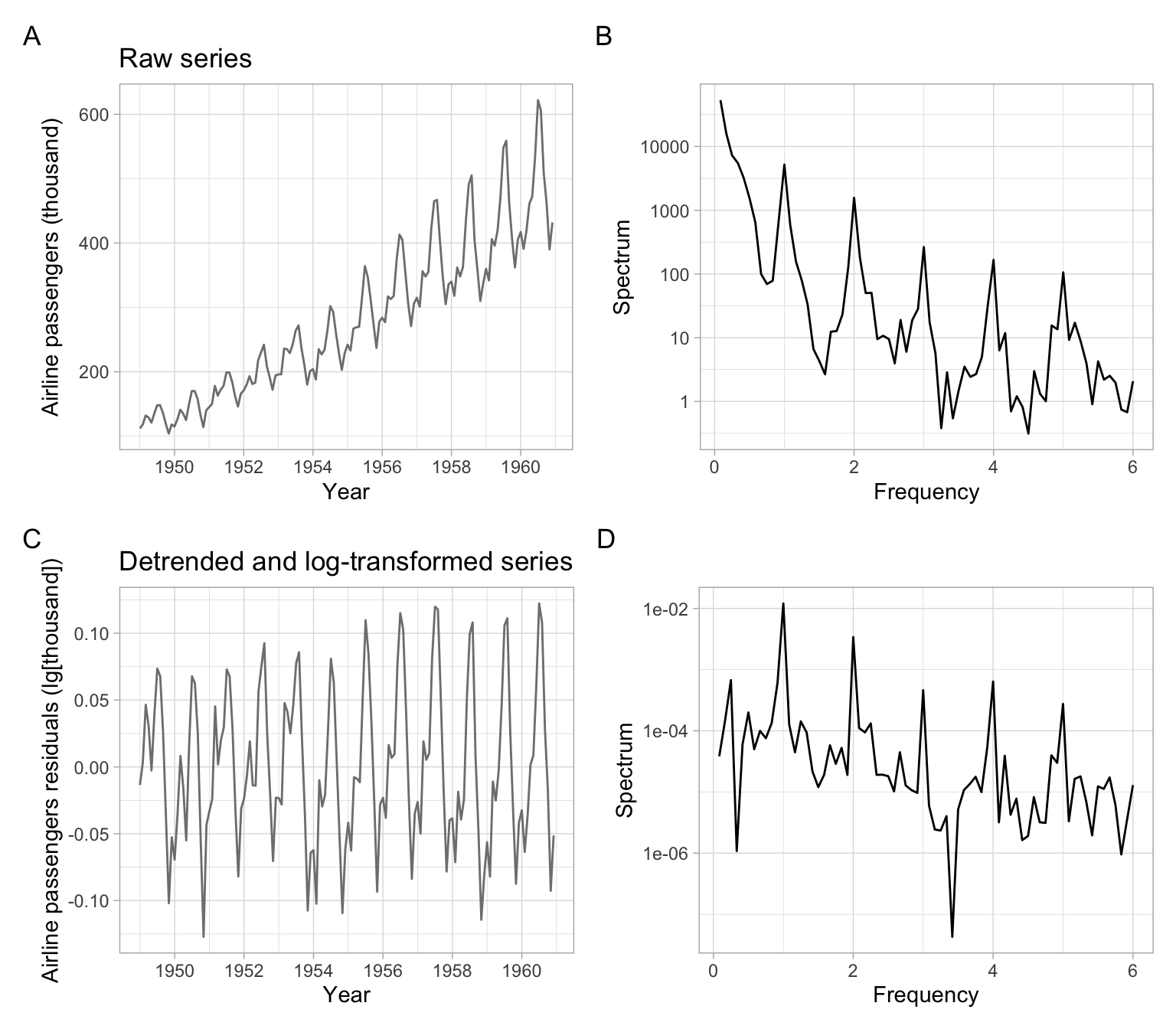 An alternative approach is to analyze time series in a spectral domain, such that use a regression of present on a linear combination of sine and cosine functions. In this type of analysis, we often use periodogram plots, with frequency or period on the \(x\)-axis.